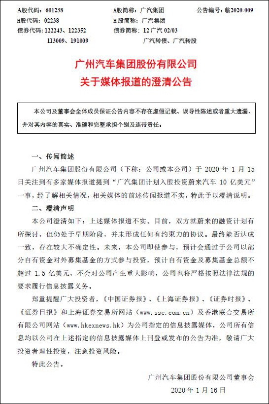 广汽集团:“计划入股蔚来10亿美元”的报道不实 不会对公司产生重大影响。